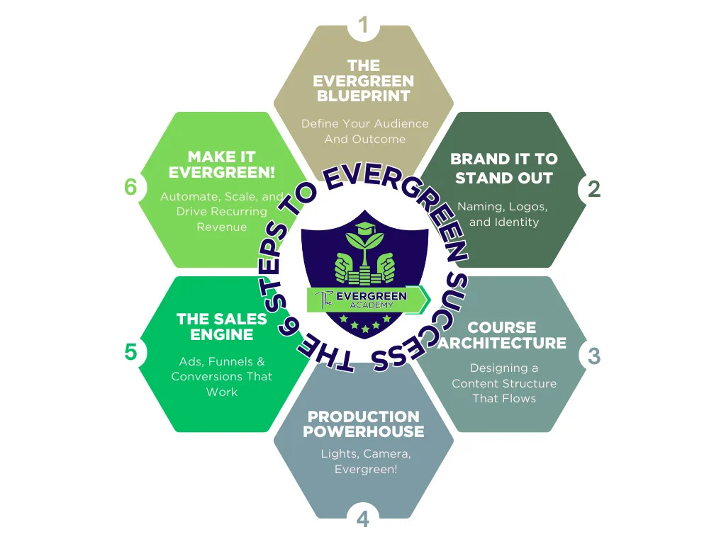 Our six-steps to evergreen success framework provides you with all the key areas you need to design, build, and launch a fully evergreen course.